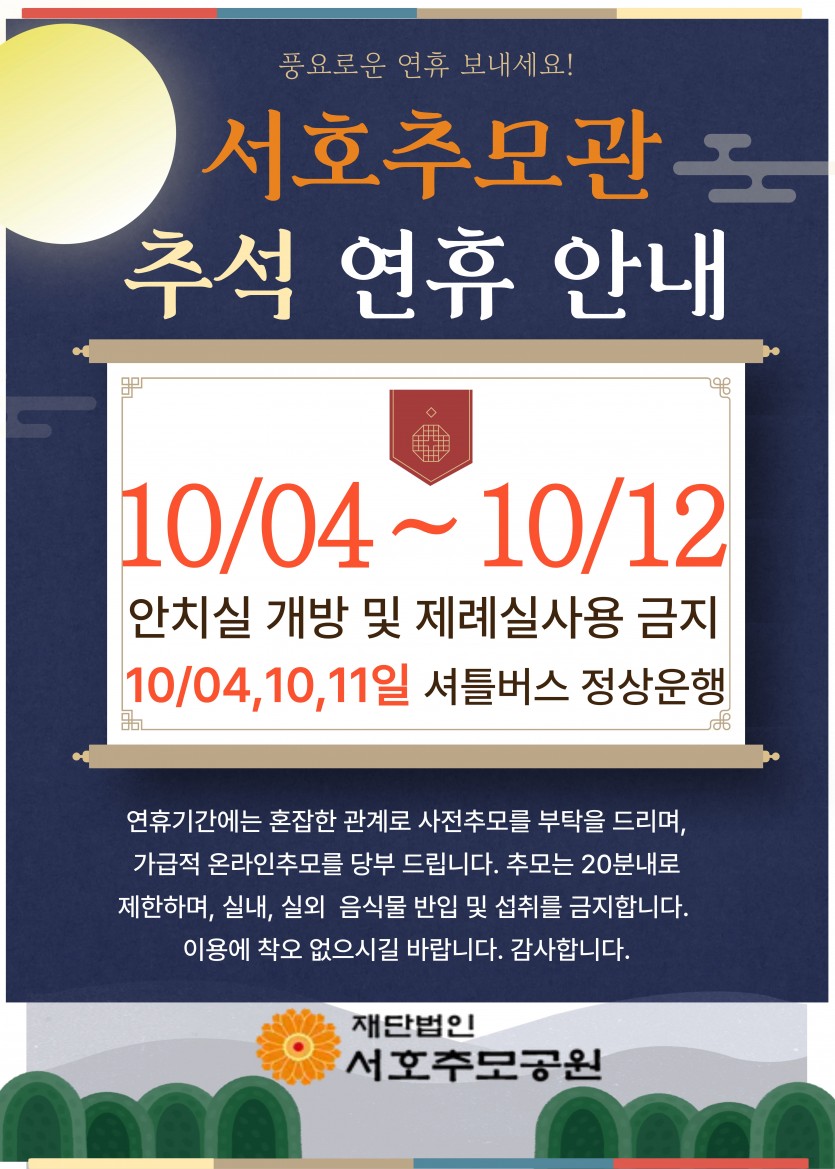 명절 연휴에는 미리 사전추모하시기를 당부드리며, 셔틀버스는 명절연휴 빨간날은 운행을 하지 않습니다. (10월03일부터 9일까지 )단 4일, 10일,11일 정상운행 합니다.