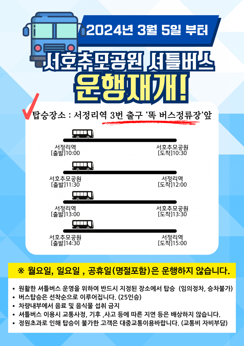 (재)서호추모공원은 교통약자를 위해 셔틀버스 운행을 2024년 3월 5일부터 재개합니다.
